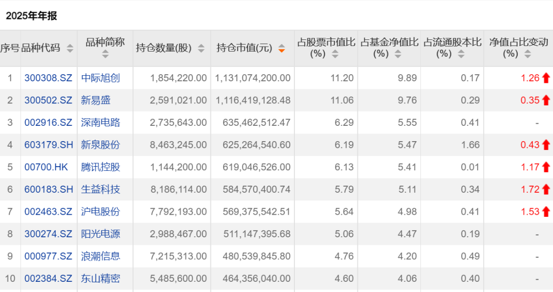 具体来看,中欧数字经济混合基金2025年收益超过140%。截至2025年底,中欧数字经济混合基金的权益投资占基金资产净值比例为88.24%,前十大重仓股同样发生较大变化。截至2025年底,深南电路、阳光电源、浪潮信息、东山精密新进为中欧数字经济混合基金前十大重仓股。