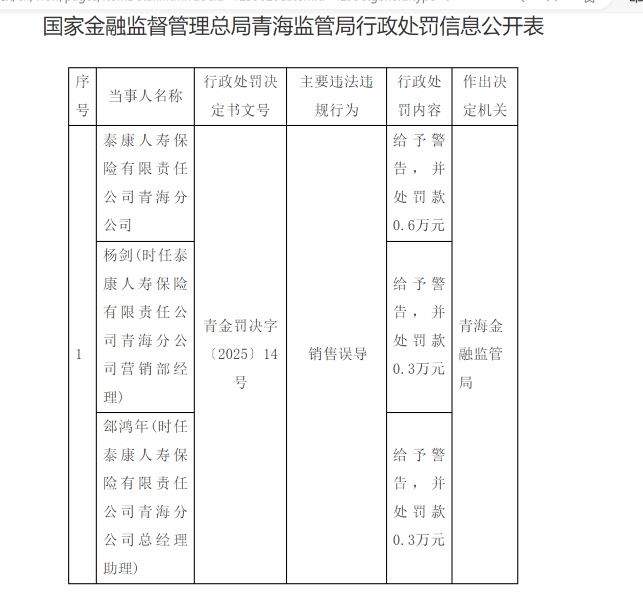 杨剑(时任泰康人寿保险有限责任公司青海分公司营销部经理),被给予警告并处罚款0.3万元;郐鸿年(时任泰康人寿保险有限责任公司青海分公司总经理助理),被给予警告并处罚款0.3万元。